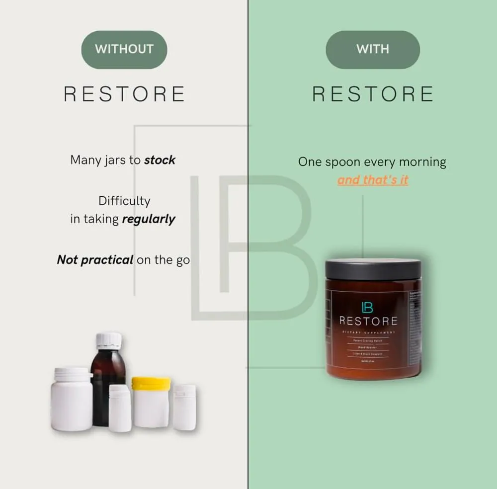 Created by someone who's been there — and backed by the latest breakthroughs in nutritional neuroscience — Restore is a complete, all-in-one formula designed to: